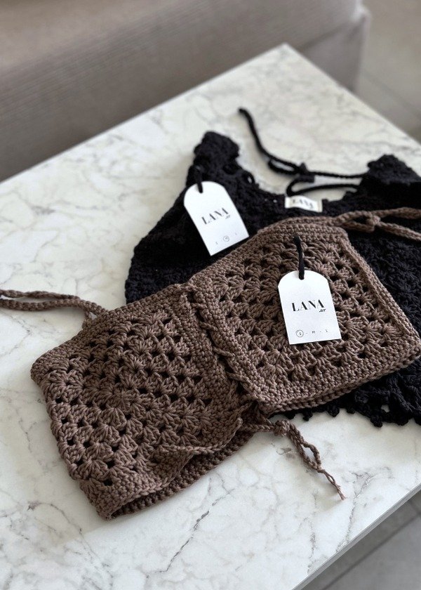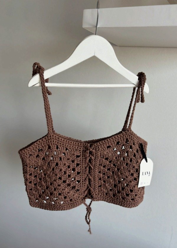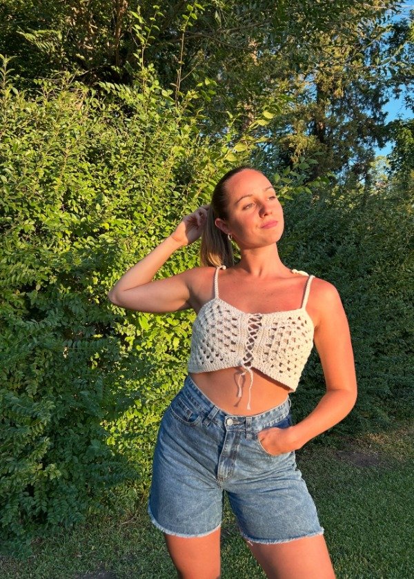 Crop top tejido a mano con tiras regulables en hombros y entrelazado de ajuste en escote - 100% algodón peinado.